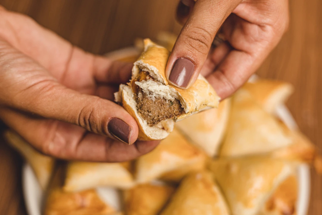 Massa Tradicional e fofinha de esfiha, em formato triangular, recheada com carne moída bem temperada, ao estilo árabe.