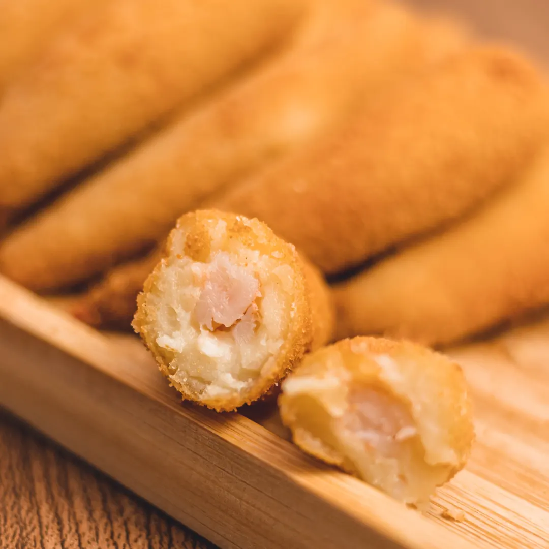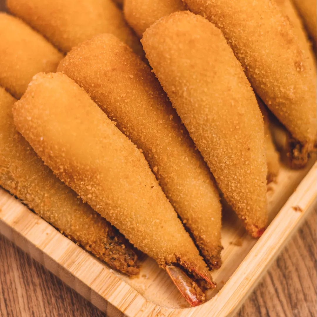 Camarão limpo, e com um tempero de comer rezando, empanado com nossa deliciosa massa tradicional cozida (é daquelas que derrete na boca e com um sabor incrivelmente saboroso) e aquela crosta crocante do empanado de farinha de rosca!
